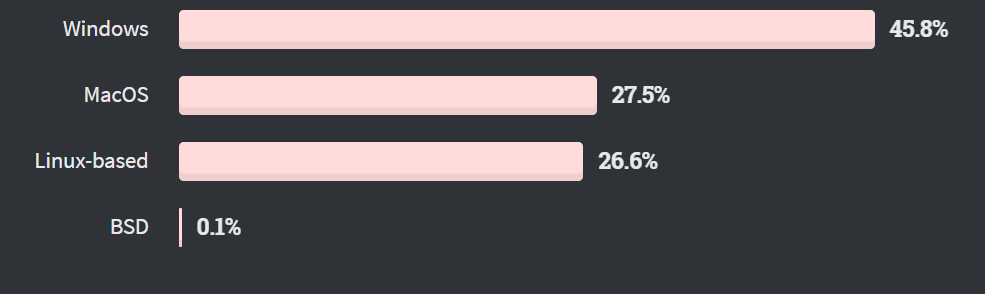 几乎一半的受访者使用 Windows 作为其主要操作系统。其余的几乎平均分配给MacOS和Linux版本。