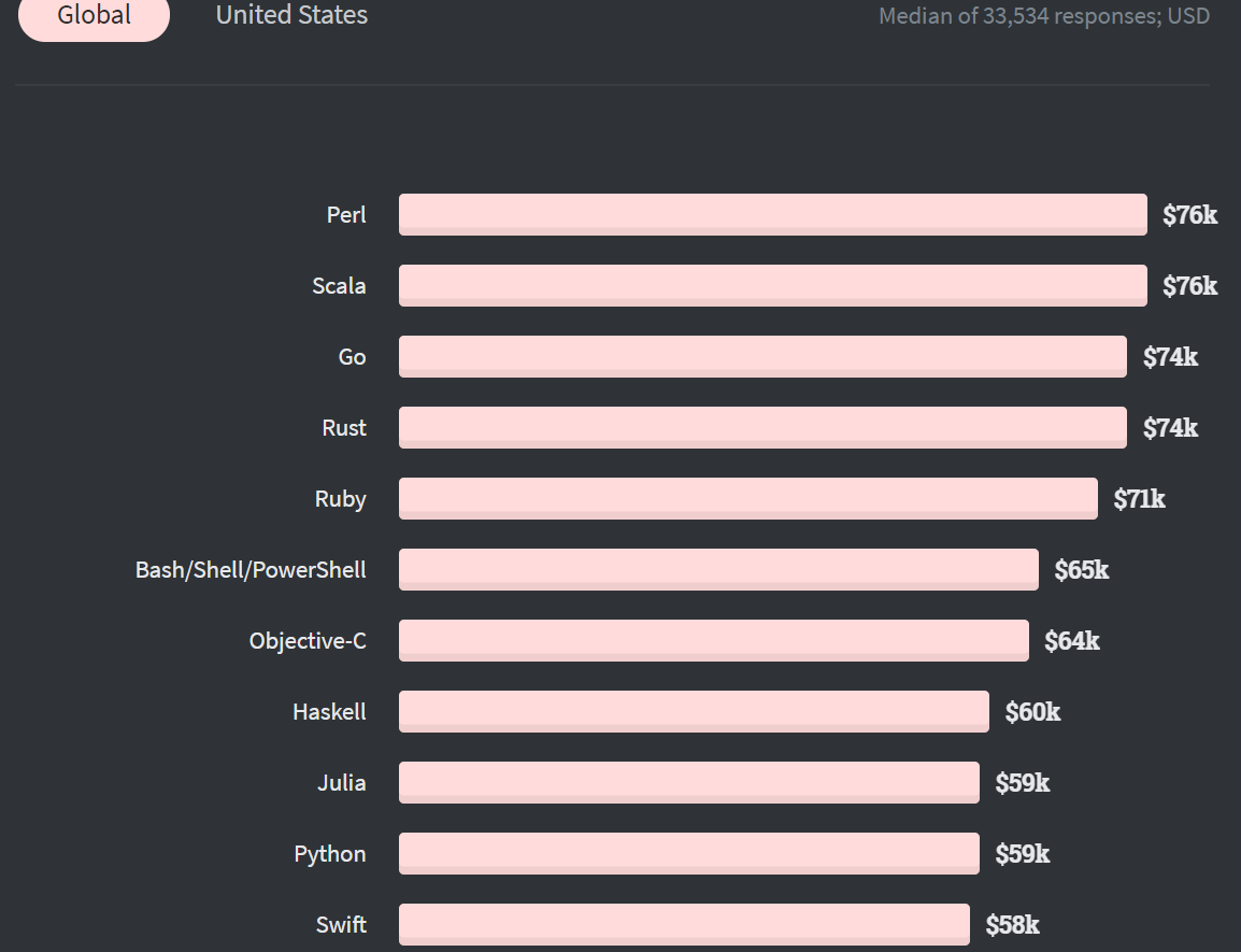 最后,在薪酬最高的编程语言方面,全球范围内,使用 Perl、Scala 和 Go 的受访者薪水最高,中位数约为 $ 75k;Java 开发者薪酬稍低,处于垫底地位。当只看美国时,Scala 开发人员的薪水往往最高。