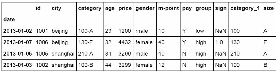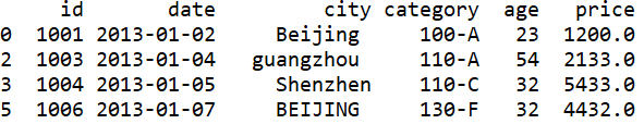 df = pd.DataFrame({"id":[1001,1002,1003,1004,1005,1006], "date":pd.date_range('20130102', periods=6), "city":['Beijing ', 'SH', ' guangzhou ', 'Shen zhen', 'shanghai', 'BEIJING '], "age":[23,44,54,32,34,32], "category":['100-A','100-B','110-A','110-C','2 10-A','130-F'], "price":[1200,np.nan,2133,5433,np.nan,4432]}, columns =['id','date','city','category','age', 'price'])