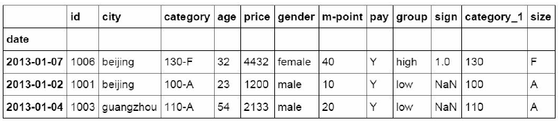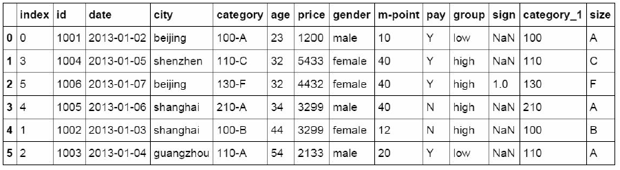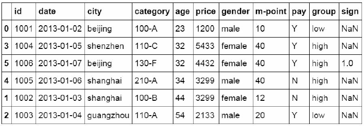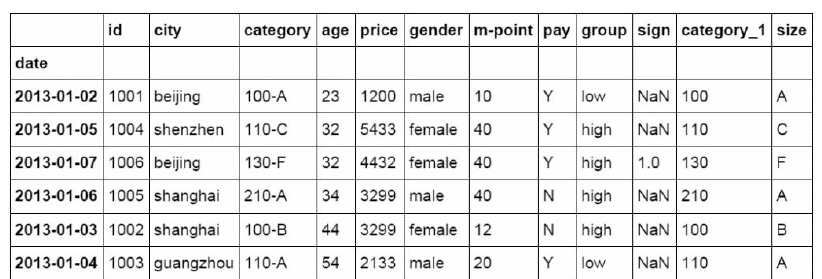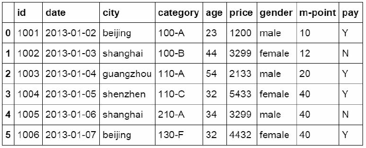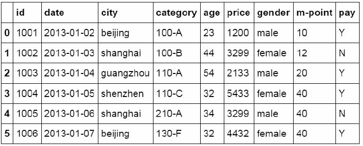 #查看列名称 df.columns Index(['id', 'date', 'city', 'category', 'age', 'price'], dtype=' object')