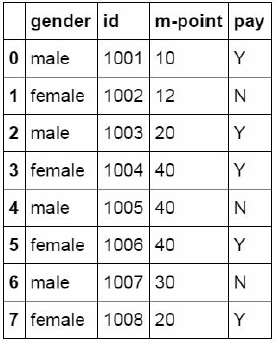 #建立df1数据表 df1=pd.DataFrame({"id":[1001,1002,1003,1004,1005,1006,1007,1008], "gender":['male','female','male','female','male ','female','male','female'], "pay":['Y','N','Y','Y','N','Y','N','Y',], "m-point":[10,12,20,40,40,40,30,20]})