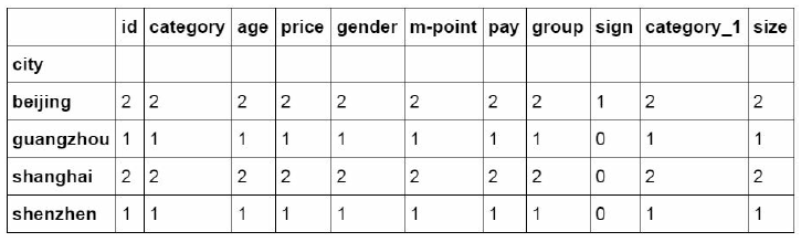 #对两个字段进行汇总计数 df_inner.groupby(['city','size'])['id'].count() city size beijing A 1 F 1 guangzhou A 1 shanghai A 1 B 1 shenzhen C 1 Name: id, dtype: int64