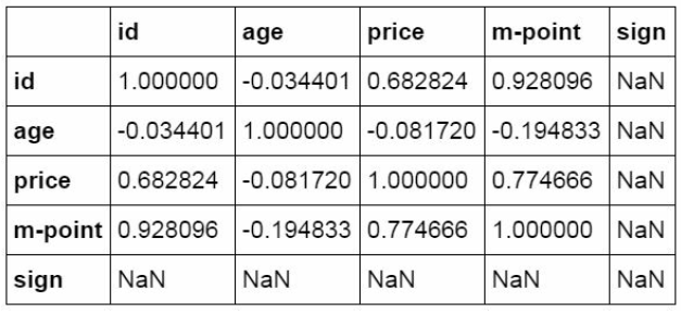 #相关性分析 df_inner['price'].corr(df_inner['m-point']) 0.77466555617085264 #数据表相关性分析 df_inner.corr()