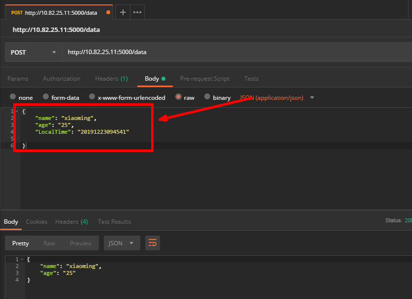@server.route('/data',methods=['post']) def post_json(): if flask.request.is_json: print(flask.request.json) name = flask.request.json.get('name') # 获取json请求体的第一个参数的值 age = flask.request.json.get('age') # 获取json请求体的第二个参数的值 data = {'name':name,'age':age} return json.dumps(data,ensure_ascii=False) else: return json.dumps({'msg':'请传json格式参数'},ensure_ascii=False)