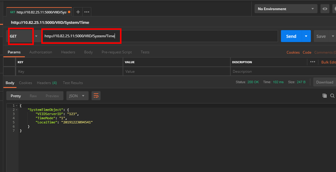# -*- coding: utf-8 -*- import flask,json import time server = flask.Flask(__name__) # 创建一个服务,把当前这个python文件当做一个服务 @server.route('/VIID/System/Time', methods=['get']) # @server.route()可以将普通函数转变为服务、接口的路径、请求方式,如果不写methods则默认get方法 def Time(): '''查询字符串:无,消息体:无,返回结果:SystemTime''' response_data = { "SystemTimeObject": { "VIIDServerID": "123", "TimeMode": "1", "LocalTime": time.strftime('%Y%m%d%H%M%S', time.localtime(time.time())), } } return json.dumps(response_data, ensure_ascii=False) if __name__ == '__main__': server.run(debug=True, port=5000, host='10.82.25.11') # 指定访问端口、host