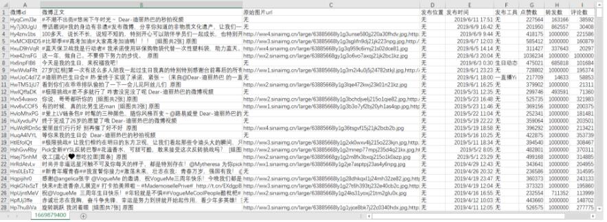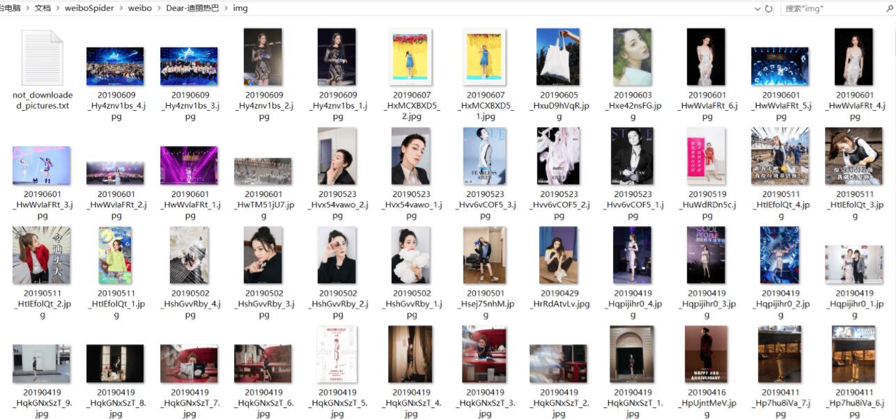本次下载了766张图片,大小一共1.15GB,包括她原创微博中的图片和转发微博转发理由中的图片。图片名为yyyymmdd+微博id的形式,若某条微博存在多张图片,则图片名中还会包括它在微博图片中的序号。本次下载有一张图片因为超时没有下载下来,该图片url被写到了not_downloaded_pictures.txt。