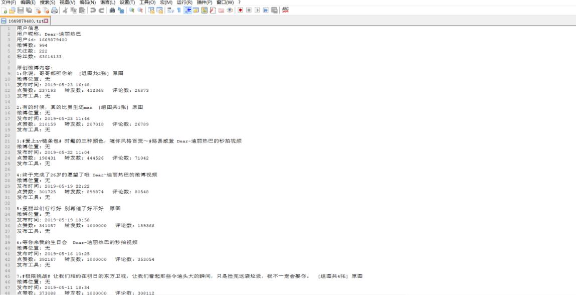 以爬取迪丽热巴的微博为例,她的微博昵称为"Dear-迪丽热巴",id为1669879400(后面会讲如何获取用户id)。我们选择爬取她的原创微博。程序会自动生成一个weibo文件夹,我们以后爬取的所有微博都被存储在这里。然后程序在该文件夹下生成一个名为"Dear-迪丽热巴"的文件夹,迪丽热巴的所有微博爬取结果都在这里。"Dear-迪丽热巴"文件夹里包含一个csv文件、一个txt文件和一个img文件夹,img文件夹用来存储下载到的图片。