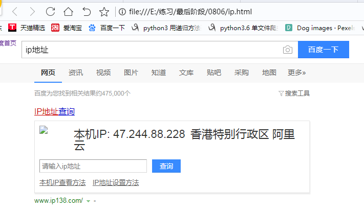 # 用到的库import requests# 写入获取到的ip地址到proxyproxy = {'https':'221.178.232.130:8080'}# 用百度检测ip代理是否成功url = 'https://www.baidu.com/s?'# 请求网页传的参数params={'wd':'ip地址'}# 请求头headers = {'User-Agent': 'Mozilla/5.0 (Windows NT 6.1; WOW64) AppleWebKit/537.36 (KHTML, like Gecko) Chrome/65.0.3325.181 Safari/537.36'}# 发送get请求response = requests.get(url=url,headers=headers,params=params,proxies=proxy)# 获取返回页面保存到本地,便于查看with open('ip.html','w',encoding='utf-8') as f: