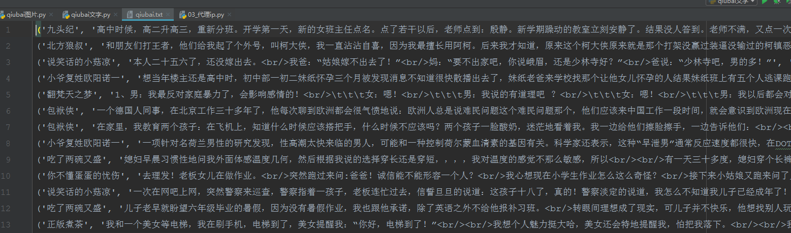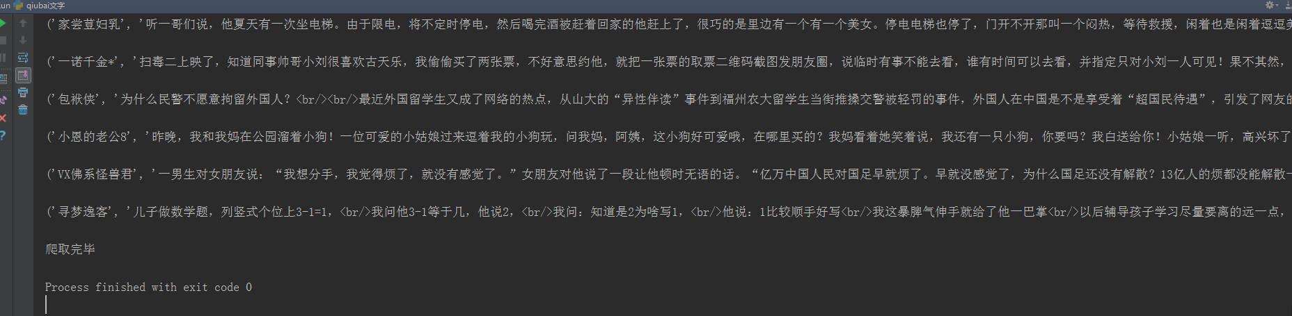 # 需要的库import requestsimport refrom multiprocessing import Pool# 设置代理ipproxy = {'https':'111.231.140.109:8888'}# 请求头headers = {'User-Agent': 'Mozilla/5.0 (Windows NT 6.1; WOW64) AppleWebKit/537.36 (KHTML, like Gecko) Chrome/65.0.3325.181 Safari/537.36'}# 主函数def get_character(url):# 请求网页,里面加入代理ipresponse = requests.get(url,headers,proxies=proxy)# 正则提取内容(作者昵称,内容,好笑数量,评论数量)data = re.findall('<h2>(.*?)</h2>.*?<div class="content">.*?<span>(.*?)</span>.*?</div>.*?<span class="stats-vote">.*?' '<i class="number">(.*?)</i>(.*?)</span>.*?<i class="number">(.*?)</i>(.*?)</a>',response.text,re.S)# 遍历获取到的数据for i in data:# 以追加方式写入当前文件加下的qiubai.txtwith open('qiubai.txt','a+',encoding='utf8') as f:# 转换为字符串格式,去空格,替换掉多余内容每条内容加换行f.write(str(i).strip().replace(r'n','')+'n')# 控制台打印查看爬取过程print(str(i).strip().replace(r'n','')+'n')# 程序入口if __name__ == '__main__':# 构造所有urlurls = ['https://www.qiushibaike.com/text/page/{}/'.format(i) for i in range(1,14)]# 开启多进程pool = Pool()# 启动程序 pool.map(get_character,urls)print('爬取完毕')