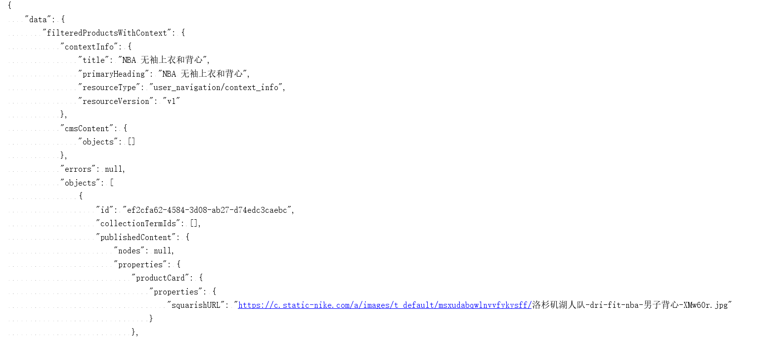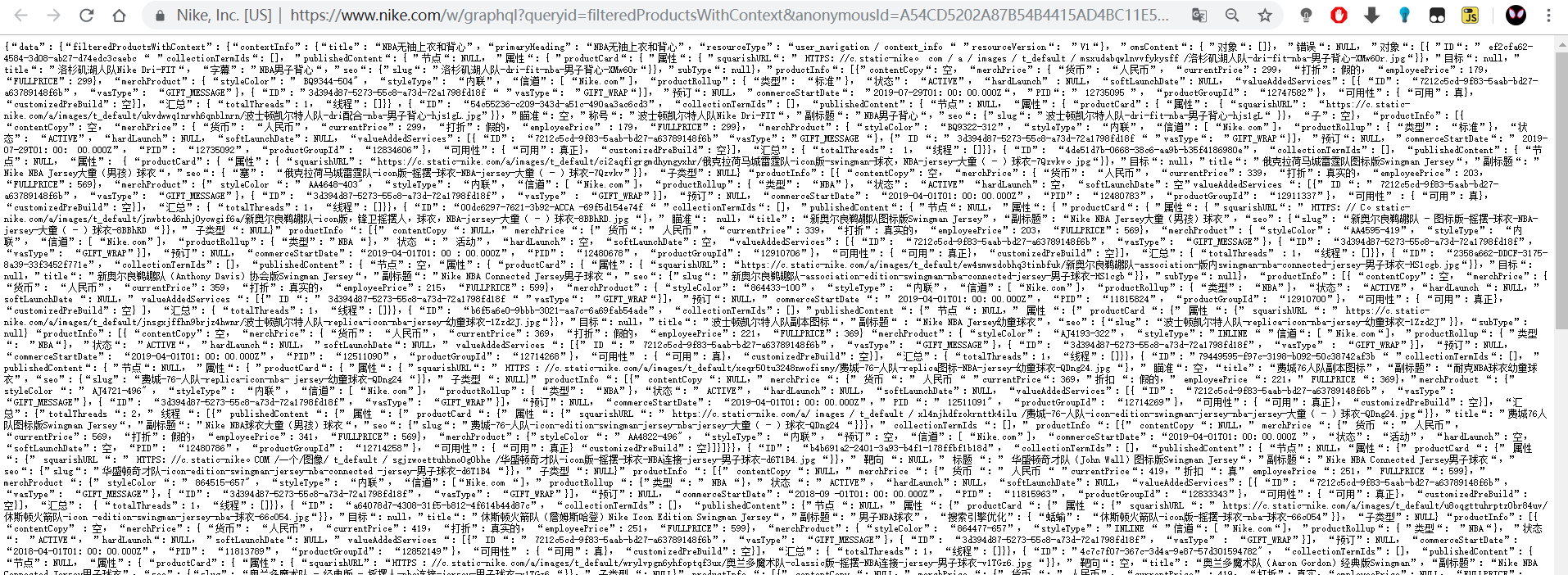 import requestsimport json#刚刚在调试台得到的地址url='https://www.nike.com/w/graphql?queryid=filteredProductsWithContext&anonymousId=A54CD5202A87B54B4415AD4BC11E5692&uuids=1c7c3d67-5d46-432d-9910-b1128d1b6503,e09eabe9-5ff0-42af-b0a3-5f68af19d89a&language=zh-Hans&country=CN&sortBy=priceAsc'#使json数据格式化输出更好观察def better_jsprint(json_obj):# 使用indent=4 这个参数对json进行数据格式化输出#因为json.dumps 序列化时对中文默认使用的ascii编码.想输出真正的中文需要指定ensure_ascii=Falsereturn json.dumps(json.loads(json_obj),indent=4,ensure_ascii=False) response=requests.get(url)print(better_jsprint(response.text))