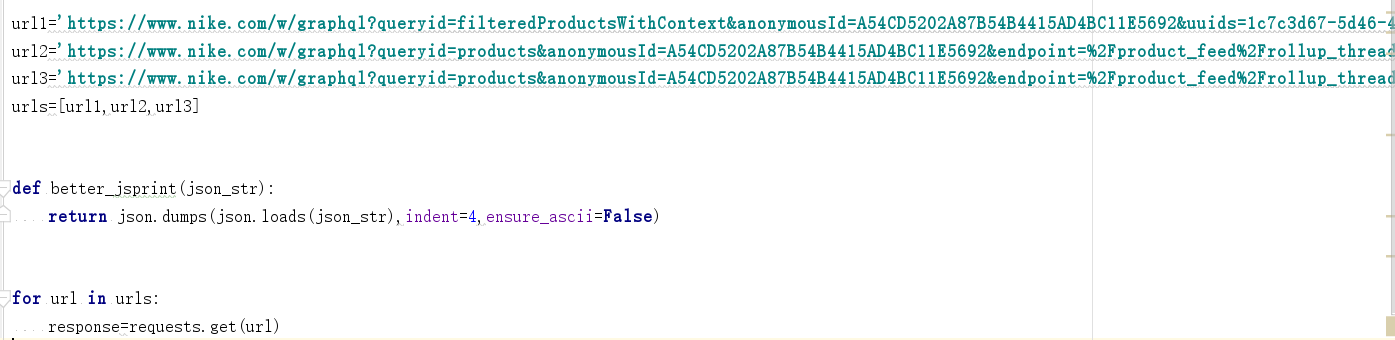 url2='https://www.nike.com/w/graphql?queryid=products&anonymousId=A54CD5202A87B54B4415AD4BC11E5692&endpoint=%2Fproduct_feed%2Frollup_threads%2Fv2%3Ffilter%3Dmarketplace(CN)%26filter%3Dlanguage(zh-Hans)%26filter%3DemployeePrice(true)%26filter%3DattributeIds(1c7c3d67-5d46-432d-9910-b1128d1b6503%2Ce09eabe9-5ff0-42af-b0a3-5f68af19d89a)%26anchor%3D24%26count%3D24%26consumerChannelId%3Dd9a5bc42-4b9c-4976-858a-f159cf99c647%26sort%3DproductInfo.merchPrice.currentPriceAsc'url3='https://www.nike.com/w/graphql?queryid=products&anonymousId=A54CD5202A87B54B4415AD4BC11E5692&endpoint=%2Fproduct_feed%2Frollup_threads%2Fv2%3Ffilter%3Dmarketplace(CN)%26filter%3Dlanguage(zh-Hans)%26filter%3DemployeePrice(true)%26filter%3DattributeIds(1c7c3d67-5d46-432d-9910-b1128d1b6503%2Ce09eabe9-5ff0-42af-b0a3-5f68af19d89a)%26anchor%3D48%26count%3D24%26consumerChannelId%3Dd9a5bc42-4b9c-4976-858a-f159cf99c647%26sort%3DproductInfo.merchPrice.currentPriceAsc'
