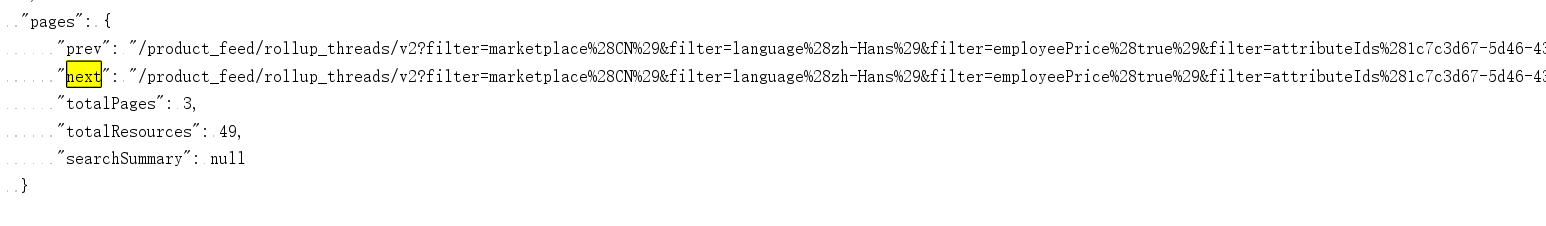 尝试检索下next中的内容,发现真的存在与endpoint参数后面,哦霍 现在我们猜想,会不会每个json中都包含pages next这个数据