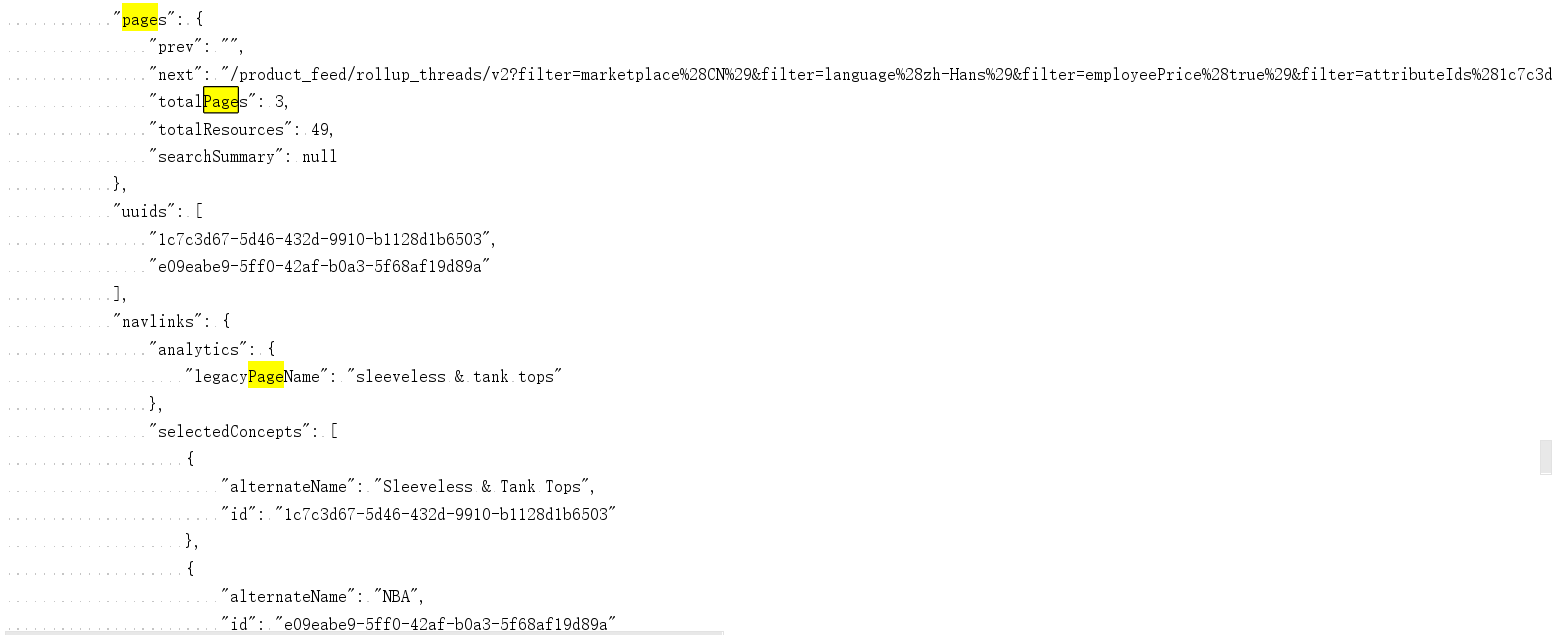 我们再回头看看第一次抓取下来的 url1 的json数据,首先尝试下检索page这个关键词(毕竟一般程序员都会写这个作为页面标识吧?),哦霍,发现了了不得的东西,