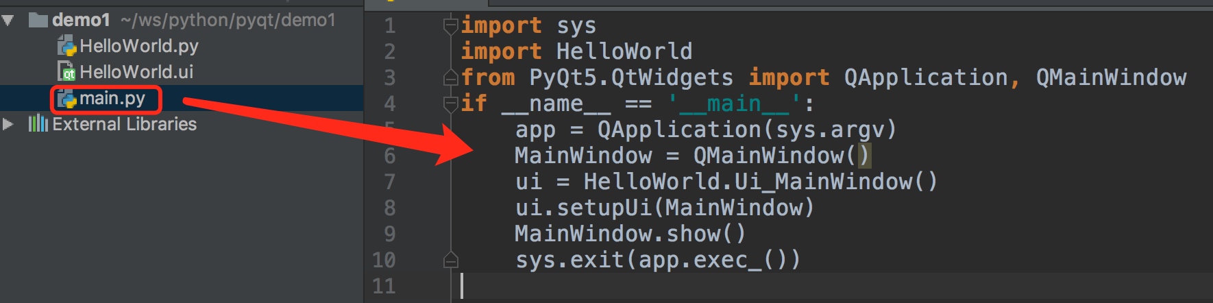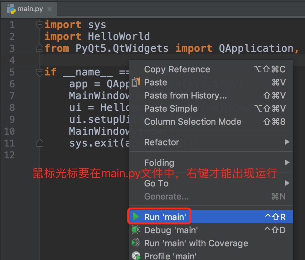 import sys import HelloWorld from PyQt5.QtWidgets import QApplication, QMainWindow if __name__ == '__main__': app = QApplication(sys.argv) MainWindow = QMainWindow() ui = HelloWorld.Ui_MainWindow() ui.setupUi(MainWindow) MainWindow.show() sys.exit(app.exec_())