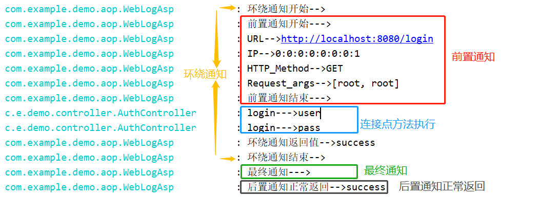 @Before("controllerLog()")public void beforeAdvice(JoinPoint joinPoint){ logger.info("前置通知开始--->");/*获取当前请求的HttpServletRequest*/RequestAttributes requestAttributes = RequestContextHolder.getRequestAttributes(); HttpServletRequest request = ((ServletRequestAttributes)requestAttributes).getRequest(); logger.info("URL-->"+request.getRequestURL().toString()); logger.info("IP-->"+request.getRemoteAddr()); logger.info("HTTP_Method-->"+request.getMethod()); logger.info("Request_args-->"+ Arrays.toString(joinPoint.getArgs())); logger.info("前置通知结束--->"); }