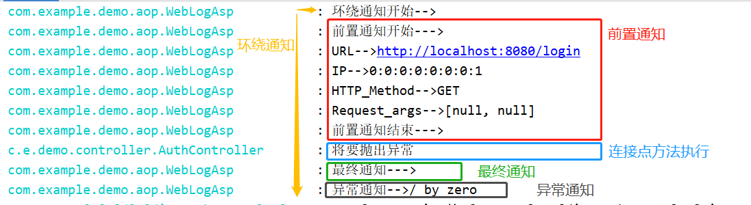 前置通知是完完全全走完的。前置通知完毕后,下来是连接点的方法运行起来了,这里因为抛出了异常,没有进行捕获,最终通知还是一样正常执行,不过最后执行的是异常的通知,