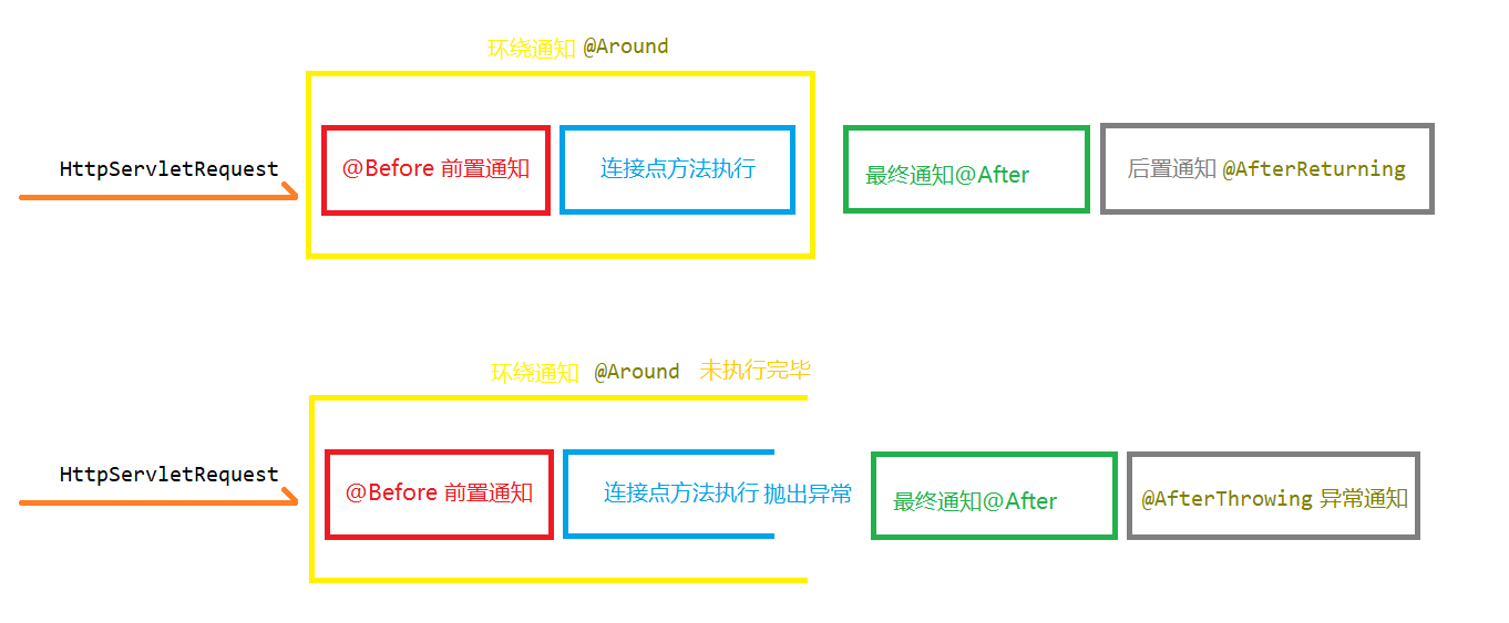 这里可以很明确的看到,一个正常的返回路径,相信我不说大家都可以看的清楚,画图最清楚的,接收到请求后,首先工作的是环绕通知,