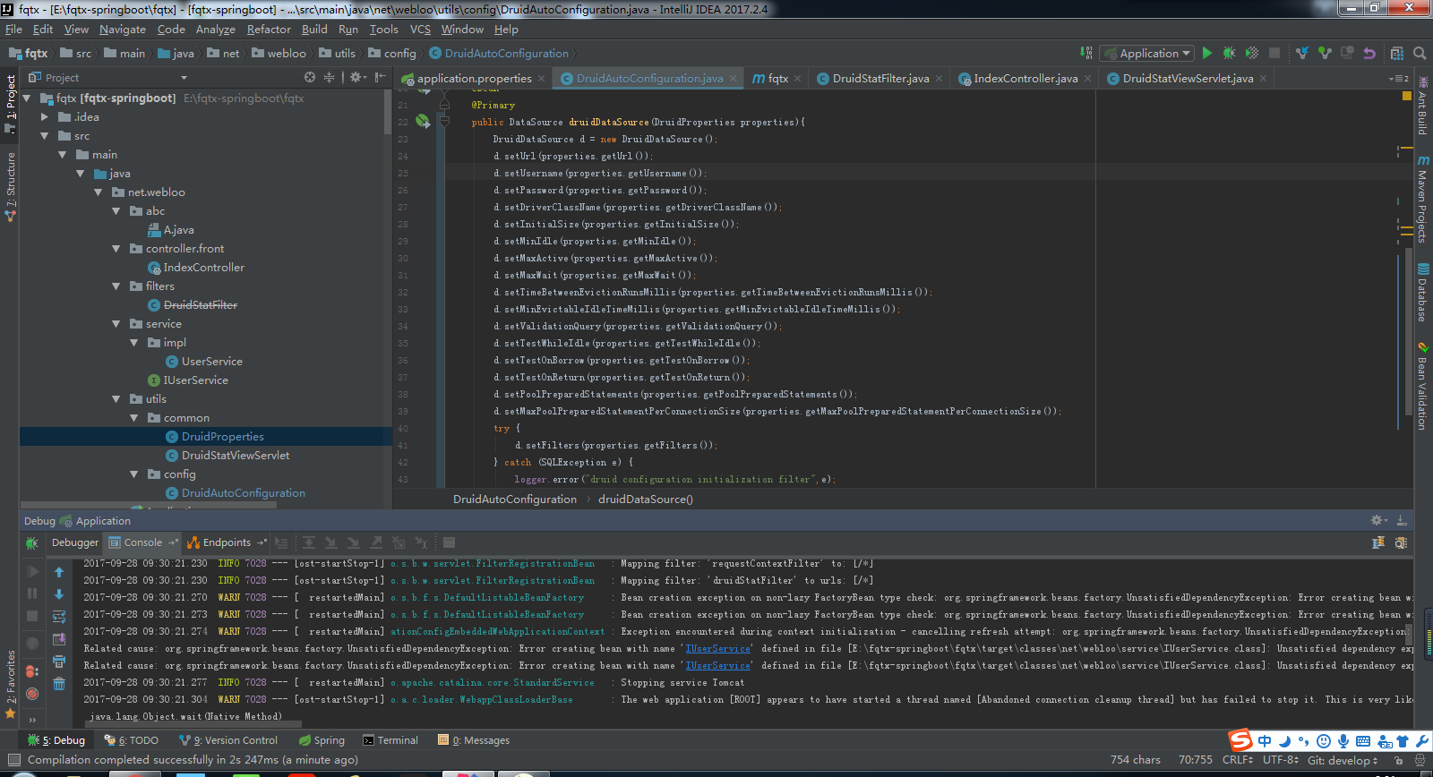 Related cause: org.springframework.beans.factory.UnsatisfiedDependencyException: Error creating bean with name 'IUserService' defined in file [E:fqtx-springbootfqtxtargetclassesnetweblooserviceIUserService.class]: Unsatisfied dependency expressed through bean property 'sqlSessionFactory'; nested exception is org.springframework.beans.factory.UnsatisfiedDependencyException: Error creating bean with name 'sqlSessionFactory' defined in class path resource [org/mybatis/spring/boot/autoconfigure/MybatisAutoConfiguration.class]: Unsatisfied dependency expressed through method 'sqlSessionFactory' parameter 0; nested exception is org.springframework.beans.factory.BeanCreationException: Error creating bean with name 'druidDataSource' defined in class path resource [net/webloo/utils/config/DruidAutoConfiguration.class]: Bean instantiation via factory method failed; nested exception is org.springframework.beans.BeanInstantiationException: Failed to instantiate [javax.sql.DataSource]: Factory method 'druidDataSource' threw exception; nested exception is java.lang.IllegalArgumentException: maxActive can't not set zero