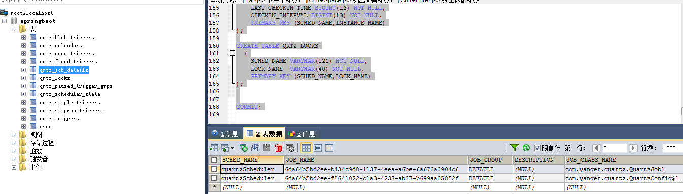 这样持久化就已经配置好了,我们执行sql,再启动项目,启动完成后,我们可以看到数据库中已经有我们的定时调度数据了。
