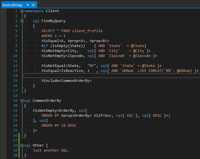 namespace Customer { sql GetByIds { SELECT * FROM [Customer] WHERE Id IN @Ids } }