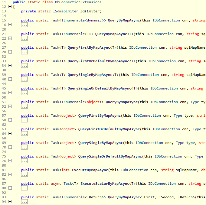 public class EmbeddedResourceSqlEmiter : ISdmapEmiter { public static EmbeddedResourceSqlEmiter CreateFrom(Assembly assembly); // ... } public class MultipleAssemblyEmbeddedResourceSqlEmiter : ISdmapEmiter { public static MultipleAssemblyEmbeddedResourceSqlEmiter CreateFrom(params Assembly[] assemblies); // ... } public class FileSystemSqlEmiter : ISdmapEmiter { public static FileSystemSqlEmiter FromSqlDirectory( string sqlDirectory, bool ensureCompiled = false); public static FileSystemSqlEmiter FromSqlDirectoryAndWatch( string sqlDirectory, bool ensureCompiled = false); // ... }