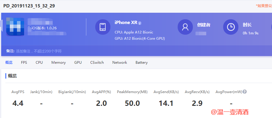 3) Device:设备利用率(整体GPU利用率)Network(Recv/Send,测试目标进程流量,和Xcode结果一致)