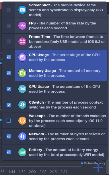 PerfDog支持移动平台所有应用程序(游戏、APP应用、浏览器、小程序等)及Android模拟器,桌面应用程序PerfDog支持在Windows和Mac机器使用运行。在iOS和Android平台获取性能参数如下: