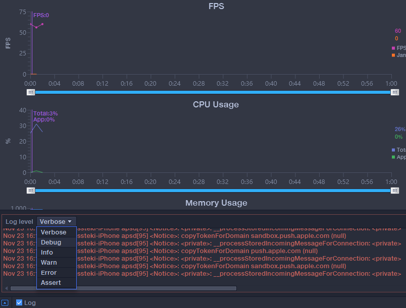 在perfdog界面,可以查看对应日志,也可以设置查看日志的等级,如下: