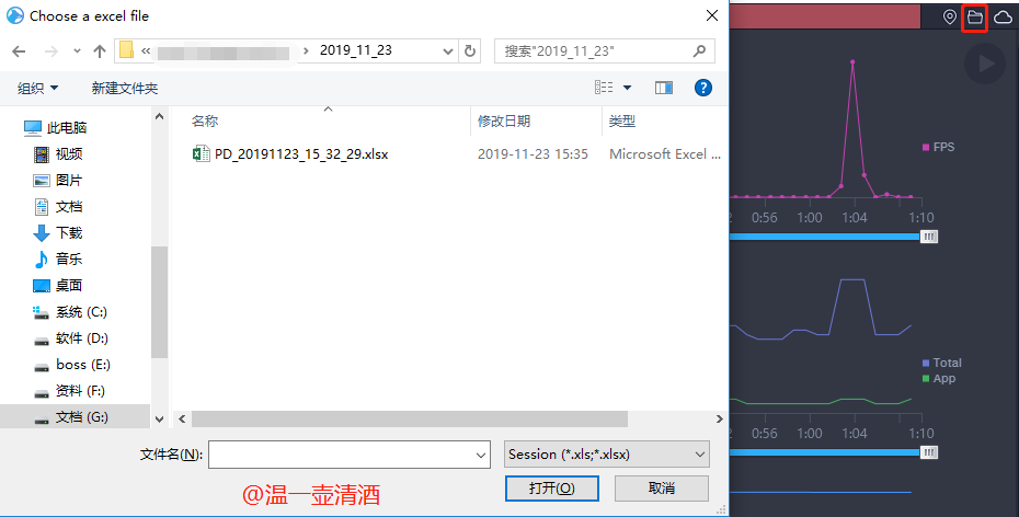 点击perfdog界面上的文件夹按钮,选择对应的本地数据,即可以回放记录,操作如下: