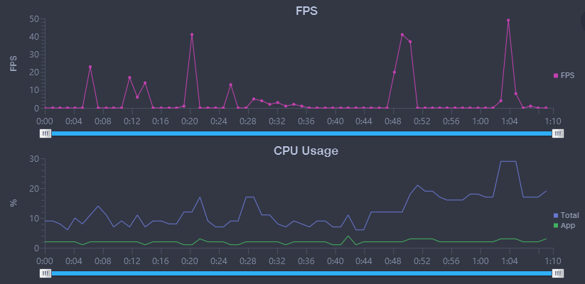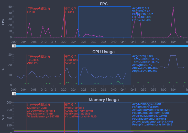2) Delta(FTime):增量耗时(平均每小时两帧之间时间差>100ms的次数)CPU Usage(Total整机/App进程,统计结果合Xcode一致)