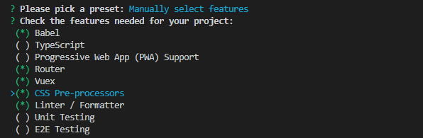 ( ) Babel //转码器,可以将ES6代码转为ES5代码,从而在现有环境执行。 ( ) TypeScript// TypeScript是一个JavaScript(后缀.js)的超集(后缀.ts)包含并扩展了 JavaScript 的语法,需要被编译输出为 JavaScript在浏览器运行,目前较少人再用 ( ) Progressive Web App (PWA) Support// 渐进式Web应用程序 ( ) Router // vue-router(vue路由) ( ) Vuex // vuex(vue的状态管理模式) ( ) CSS Pre-processors // CSS 预处理器(如:less、sass) ( ) Linter / Formatter // 代码风格检查和格式化(如:ESlint) ( ) Unit Testing // 单元测试(unit tests) ( ) E2E Testing // e2e(end to end) 测试