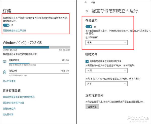 打开“设置”→“系统”→“存储”,会看到一项“存储感知”功能,点开后则是一个清理频率选项。