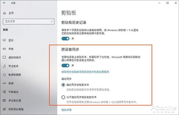 在Win10中,只要点击“选项”→“系统”→“剪切板”,开启“跨设备同步”和“自动同步复制的文本”,即可实现这一想法。