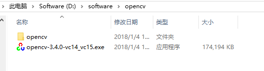 由于编写本教程时使用的是Window 10(64位)操作系统,所以这里点击:Win pack 下载最新版本的OpenCV(opencv-3.4.0-vc14_vc15.exe),下载完成双击后解压到一个目录下,这里的目录是:D:softwareopencv ,目录文件结构如下 -