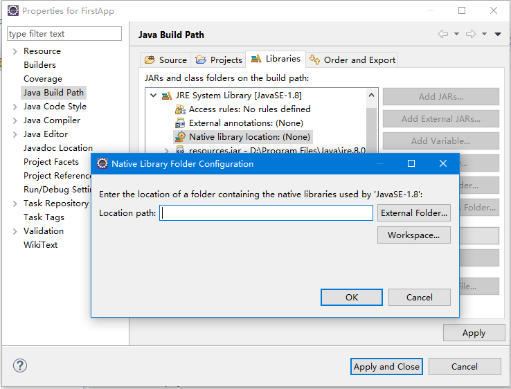 第3步 - 双击本机库位置(Native library location)。 在这里,可以看到如下所示的“本地库文件夹配置”窗口。