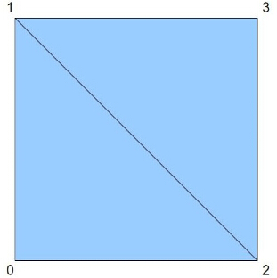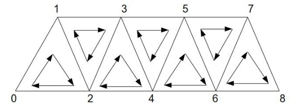 三角带有一条关于三角形内部环绕顺序的重要性质——奇数三角形的环绕顺序是反向的。这就意味着如下的顺序:[0,1,2],[1,3,2], [2,3,4], [3,5,4],以此类推。下面的图片显示了这个顺序:
