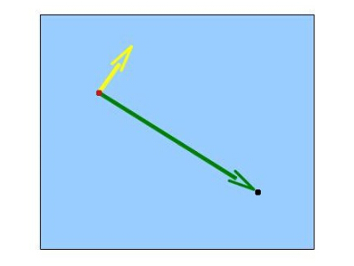 现在对这两个矢量做一个叉乘,结果是一个垂直于这两个矢量创建的平面的矢量,我们可以通过这个矢量对这个点进行扩展并创建出四边形。这个四边形将会垂直于从 billboard 到相机的矢量,这就是我们想要的。由上面的情况可知,我们能得到以下内容(黄色的矢量就是叉乘的结果):