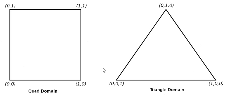 在 TCS 着色器完成之后数据会进入固定功能阶段 PG 中,它的任务就是进行细分操作。这对于新手来说可能会比较迷惑。因为 PG 并不是真正对 TCS 着色器输出的 patch 进行细分。实际上它并没有权限去接触它。相反的是,它借助于 TLs 在一个特定的空间中进行细分操作。这个特定的空间可以是一个规范化的(在[0.0 ~ 1.0]之间)二维矩形或者一个由三维质心坐标(Barycentric coordinates)定义的一个等边三角形: