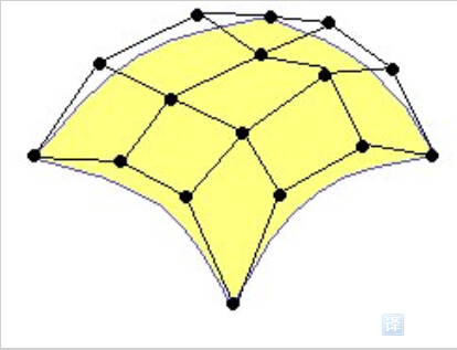TCS 着色器需要一组被称作是 Control Points (控制点)的顶点。这些顶点并没有被真正定义成如三角形、矩形、五边形或者其他的多边形。相反的是,他们定义了一个几何曲面。这个曲面一般由一些多项式公式定义,其思想就是当我们移动其中一个控制点时,它会对整个曲面的都产生影响。如果你熟悉一些图形软件,那么你可能会知道在一些图形软件中会允许你使用一系列的控制点来定义曲面或者曲线,并且通过移动这些控制点来改变他们。这一组控制点通常被称作一个 Patch。在下面图中的黄色表面就是通过由 16 个控制点组成的 patch 来实现的: