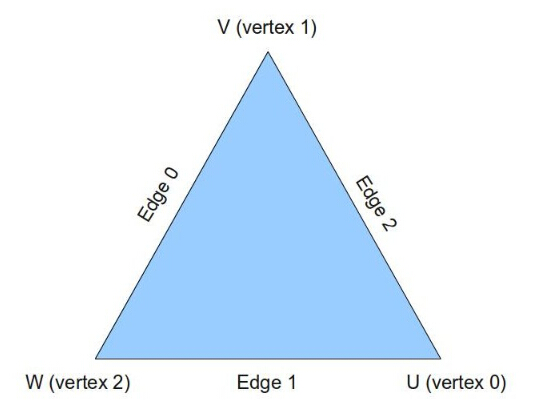 在产生输出 patch 之后,我们计算 TLs 的值,对于每个输出 patch,我们可以有不同的 TLs 值。OpenGL 为 TLs 提供了两个内置浮点数组: gl_TessLevelOuter (size 4) 、 gl_TessLevelInner (size 2)。在三角域里面我们只需要使用 gl_TessLevelOuter 数组的前三个成员以及 gl_TessLevelInner 数组的第一个成员(除了三角域之外还有矩形域和 isoline 域,不同的域对数组有不同的访问)。gl_TessLevelOuter 用于确定三角形每个边线上的线段的数量,gl_TessLevelInner[0] 确定三角形中将会包含多少个圈。如果我们用 U、V、W 来指定三角形的顶点,那么每个顶点对应的边线就是此顶点正对着的边: