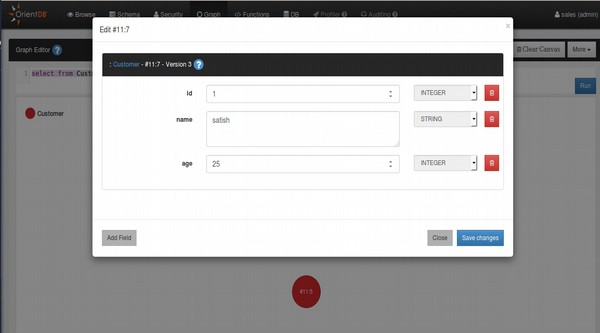 在第二步中,必须插入新顶点的字段值。 还可以添加自定义字段,因为OrientDB支持无模式模式。 要使新顶点持久化,请单击“保存更改”,顶点将被保存到数据库并添加到画布区域。