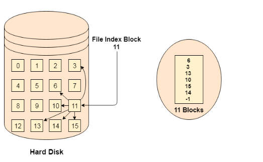 索引分配方案不是维护所有磁盘指针的文件分配表,而是将所有磁盘指针存储在一个称为索引块的块中。 索引块不包含文件数据,但它保存指向分配给该特定文件的所有磁盘块的指针。 目录条目将只包含索引块地址。