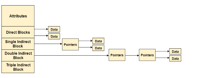 - 指向一个指针集合的磁盘块的三元索引指针。 每个指针分别指向一个磁盘块,该块还包含一组指针,这些指针分别指向一个包含指向文件块的指针的索引块。