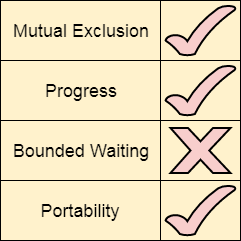 在这种机制中,如果一个进程不想进入临界区,那么它不会阻止另一进程进入临界区。 因此,这种方法肯定会提供进展。