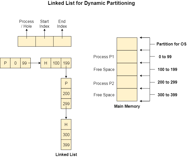 在这种方法中,操作系统维护一个链表,每个节点代表每个分区。 每个节点都有三个字段。