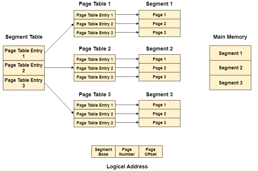 每页表都包含有关该分段每个页面的各种信息。 分段表包含有关每个分段的信息。 每个分段表项都指向一个页表项,并且每个页表项都被映射到一个分段内的页面。