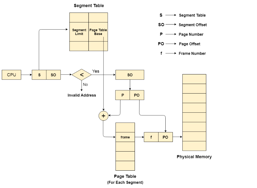CPU产生一个分为两部分的逻辑地址:分段号和分段偏移。 分段偏移必须小于分段限制量。 偏移量进一步分为分页码和分页偏移量。 为了映射页表中的确切分页码,分页码被添加到页表基地中。