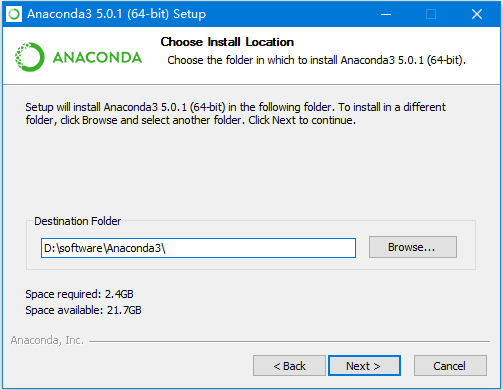 第五步:选择安装位置(D:softwareAnaconda3),如下图所示 -