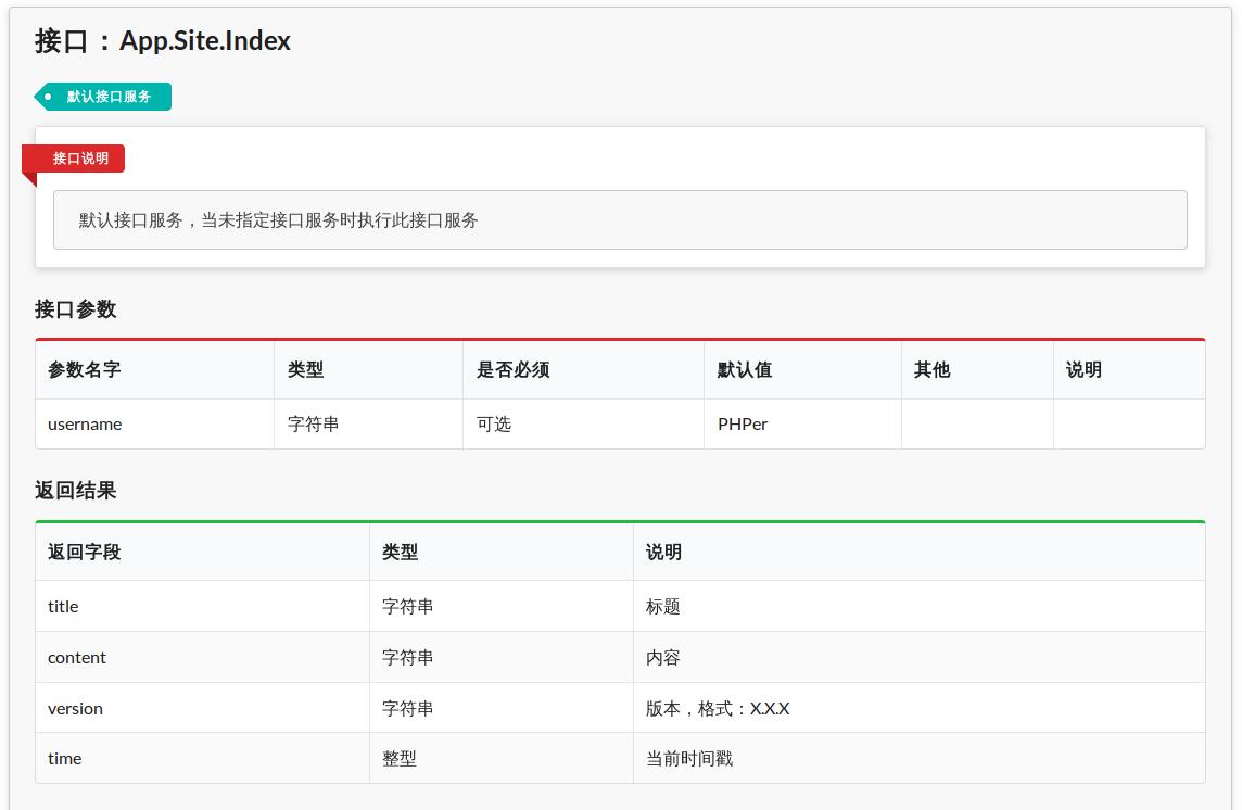 class Site extends Api {/** * 默认接口服务 * @desc 默认接口服务,当未指定接口服务时执行此接口服务 * @return string title 标题 * @return string content 内容 * @return string version 版本,格式:X.X.X * @return int time 当前时间戳 */public function index() {}}