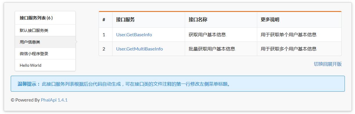 PhalApi提供一些非常实用而又贴心的功能特性,其中最具特色的就是自动生成的在线可视化文档。在线接口文档主要分为两大类,分别是: